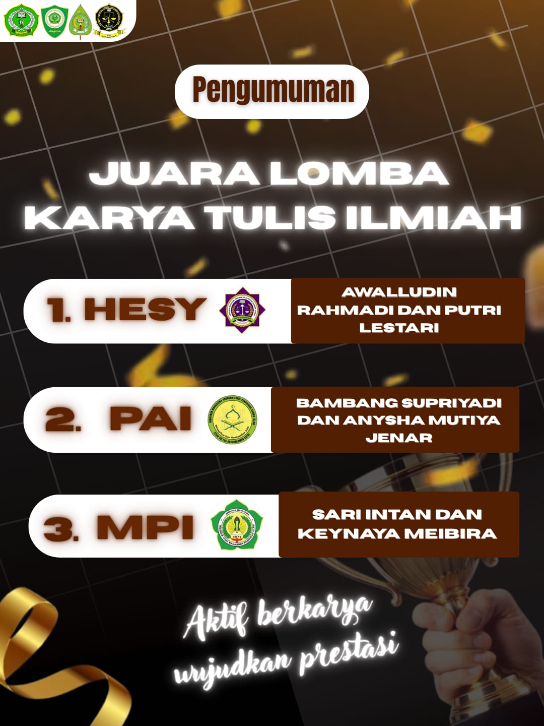 Tim yang terdiri dari Awalludin Rahmadi dan Putri Lestari ini sukses menunjukkan kualitas riset serta kemampuan analisis yang unggul dibandingkan peserta lainnya. Karya tulis yang mereka presentasikan dinilai memiliki kedalaman pembahasan, relevansi tema, dan kontribusi ilmiah yang kuat terhadap perkembangan keilmuan.